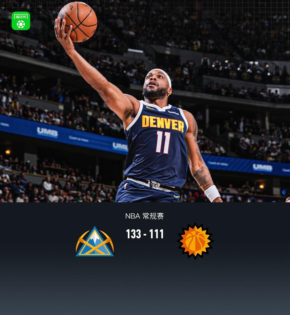 第四节掘金贾马尔-穆雷拿下7分,太阳格雷森-阿伦拿下6分,最终掘金133-111战胜太阳
